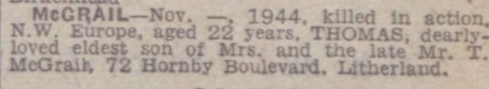 - Familie:Son of Thomas and Clara McGrail, of Liverpool, England.