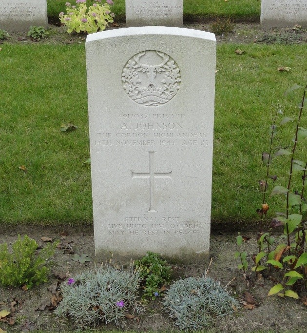 - Bijzonderheden:From his service number Private Johnson would have perhaps initially enlisted in 1939 in Walsall with the South Staffordshire Regiment. At some point he transferred to the 1st Battalion, Gordon Highlanders. This may have been on 26 August 1944. As the British Army was badly short of manpower, the 9th (Staffordshire Infantry Division) was chosen to be disbanded and its men transferred to other units to bring them up to strength. The Battalions of the South Staffordshire Regiment were part of this Division.