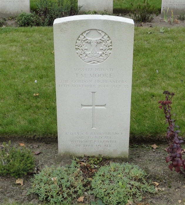 - Bijzonderheden:It would seem from his service number that Private Moore may have enlisted/been conscripted in 1939, initially with the Royal Scots. He served with the 1st Battalion Gordon Highlanders in North Africa, in the 153rd Brigade of the 51st Highland Division and the Eighth Army, and possibly also in Sicily prior to the invasion of Europe in 1944.
