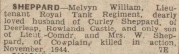 Melvyn William Sheppard Lieutenant - 11th Royal Tank Regiment, Royal Armoured Corps