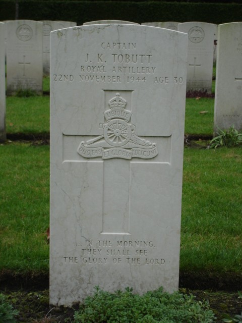 - Bijzonderheden:Captain Tobutt was commander of A-Troop (consisting of 4 pieces of QF 25-ponder howitzers) and Forward Observation Officer. Died during a German artillery attack.This soldier is mentioned in our database because he was initially buried in a field grave in our area