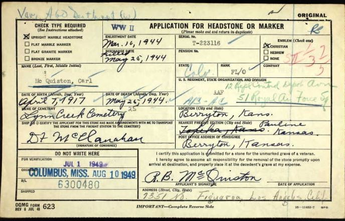 Cyrus Carl McQuiston Flight Officer - 51 Squadron RAF